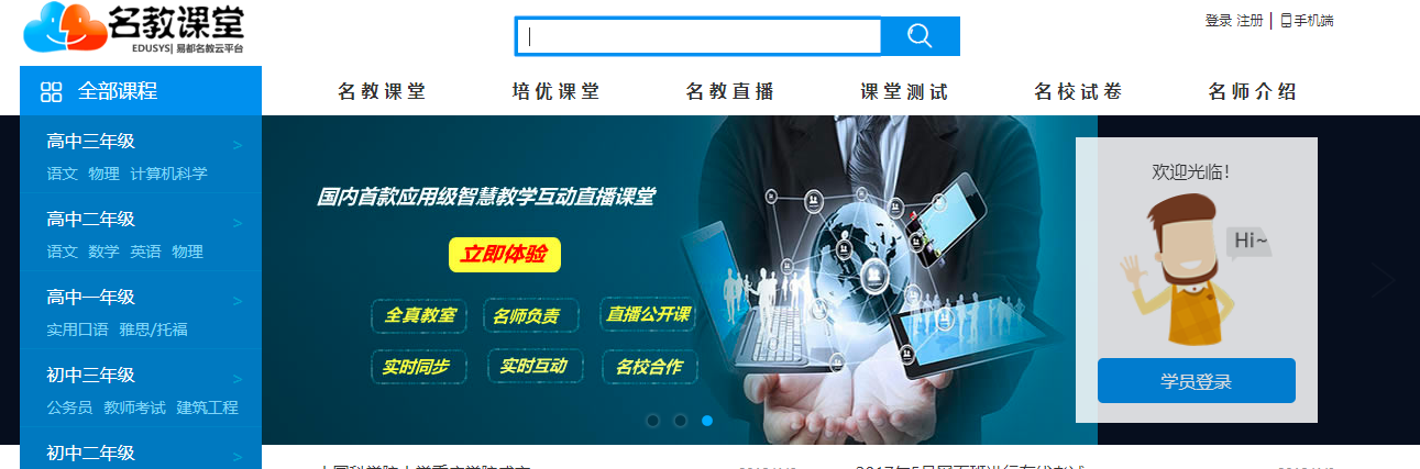 名教课堂是由湖北易都信息技术有限公司发起的一个全新的中小学在线学习和教学平台,我们融合了现代智慧教育技术及互联网,将名师名教、高等名校优等学生的学习理解方法、知识点使用视频直播+视频点播+课堂互动+答疑社区相结合的在线学习模式,将名师的讲解、名师的引导带给每一个需要的同学。