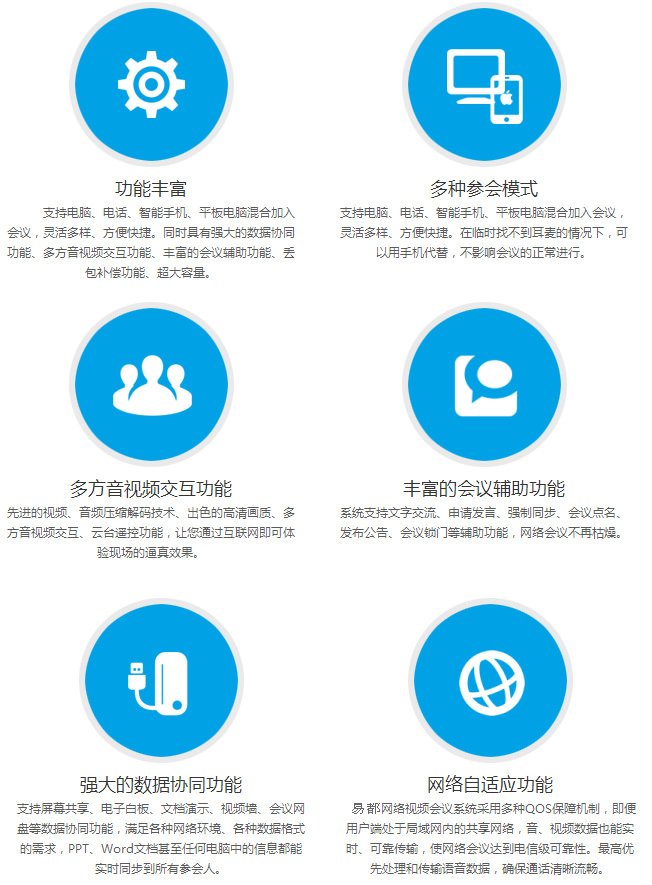 人性化设计人性化设计、齐全的功能、便利的操作以及对中国特色互联网宽带环境的完美兼容,一经推出就得到了广大客户的认可。“免培训、上手即用”这一设计理念贯穿产品的每个细节,使得无论是会议的发起方还是会议参与者,都可以很顺畅的进入“会场”,深度沟通。